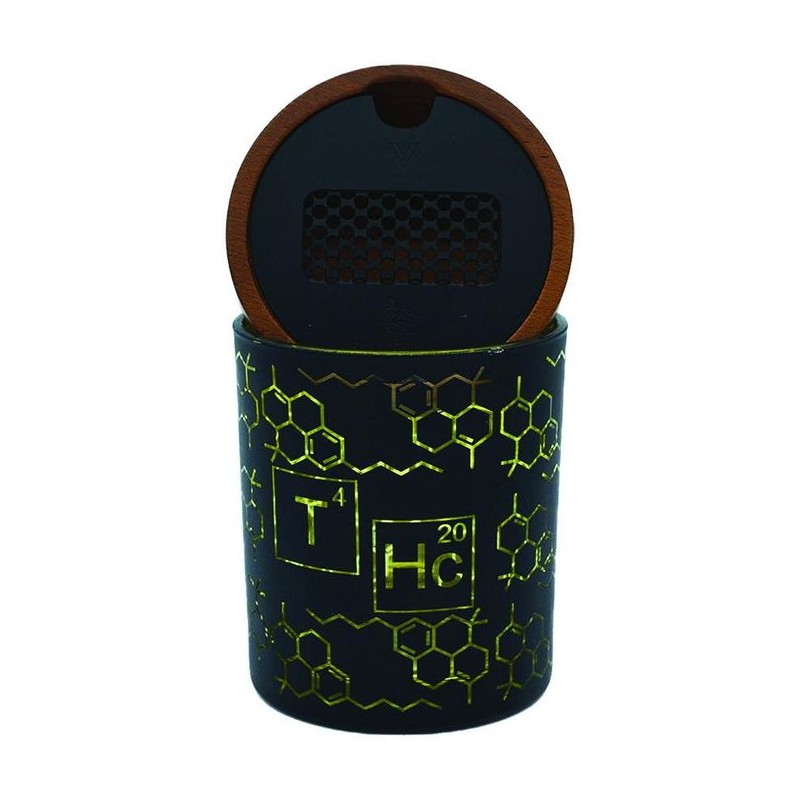 V-Syndicate SmartStash con grinder incorporato, un imbuto e un umidificatore. La parte superiore del coperchio dello SmartStash ha una piastra incorporata che ti permette di macinare le tue erbe nella ciotola di legno sottostante. Il lato inferiore del coperchio ha uno spazio per un pacchetto che è fissato da una piastra metallica. Il barattolo stash contiene 14g di fiori