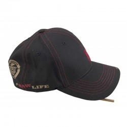 Casquette de baseball noire Raw avec logo Raw rouge brodé sur le devant. Le capuchon comporte une petite fente pour accueillir un tisonnier en bois pratique. L'accessoire parfait pour tout fumeur.