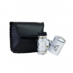 Mini microscope argenté avec grossissement 60x, lampes LED et UV. Présentoir de 10 unités comprenant une petite pochette et un coffret de présentation.