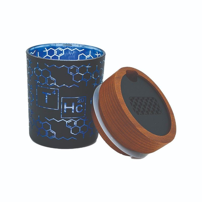 SmartStash de V-Syndicate avec broyeur intégré, entonnoir et humidificateur. Le dessus du couvercle SmartStash est doté d'une plaque de broyage intégrée vous permettant de râper vos herbes dans le bol en bois situé en dessous. Le dessous du couvercle comporte un espace pour un pack d'humidité qui est fixé par une plaque métallique. Le pot de réserve contient 14 g de fleurs Mesure 10,2 cm de hauteur